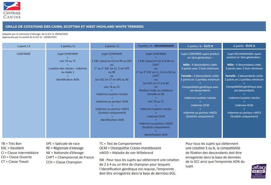 – pour les Scottish, Westies et Cairns Recommandés et Élite : photocopie du résultat du test OCM et autorisation écrite d’utilisation et diffusion signée par le propriétaire.